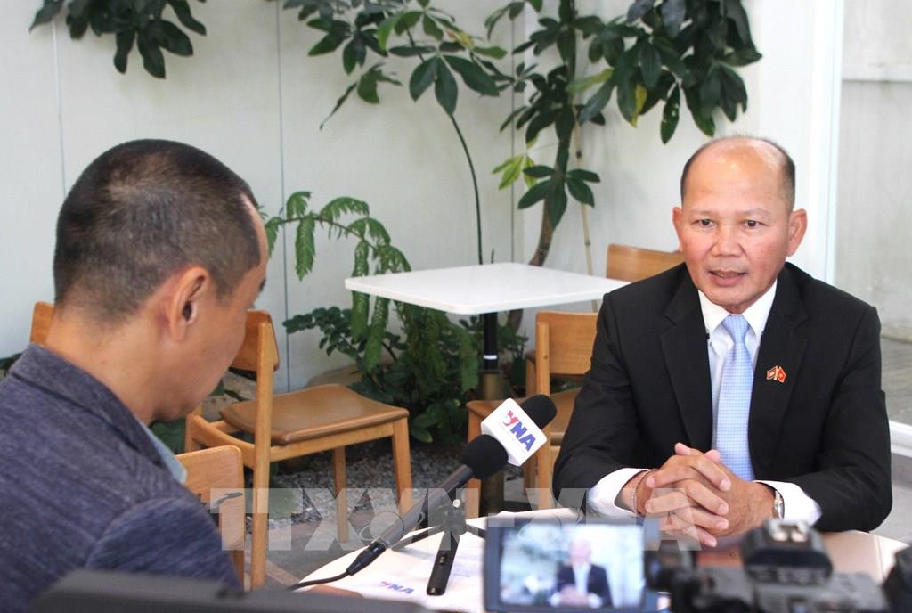 Ông Uch Leang - Quyền Vụ trưởng Vụ Nghiên cứu Á - Phi và Trung Đông, Viện Quan hệ Quốc tế Campuchia, Viện Hàn lâm Hoàng gia Campuchia (RAC), Chủ tịch Hội cựu sinh viên Campuchia học tập tại Việt Nam (CAVA) trả lời phỏng vấn phóng viên TTXVN thường trú tại Phnom Penh. Ảnh: Minh Hưng - PV TTXVN tại Campuchia