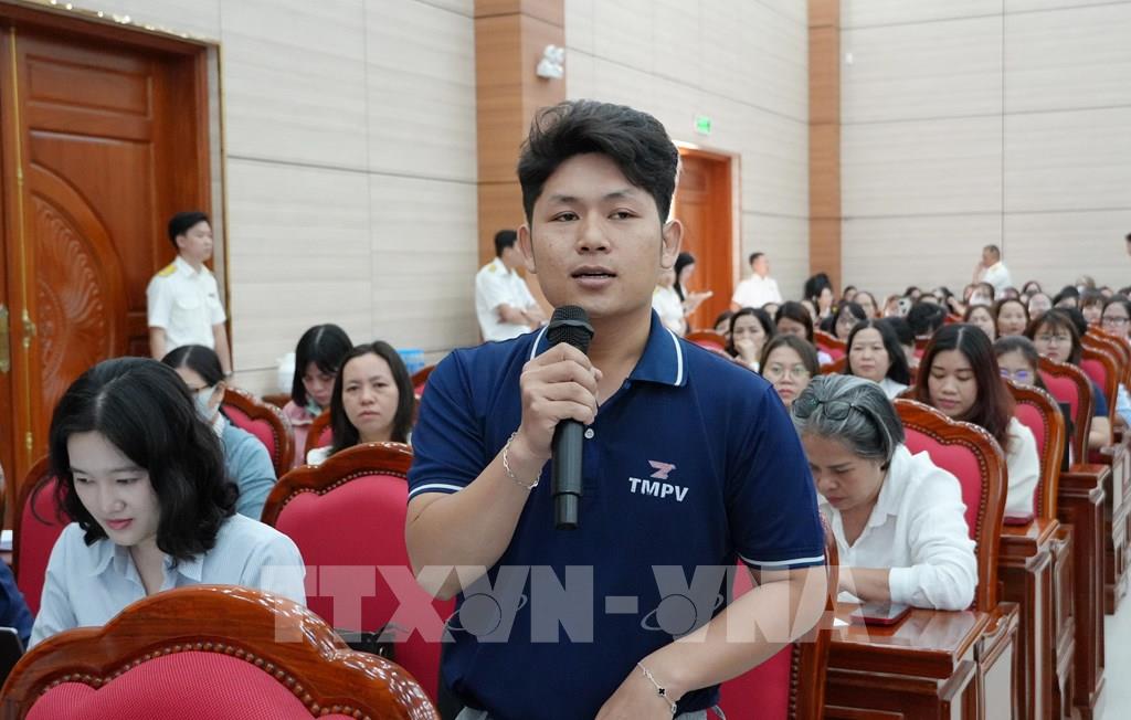 Doanh nghiệp nêu câu hỏi liên quan đến chính sách thuế tại đối thoại. Ảnh: Công Phong-TTXVN
