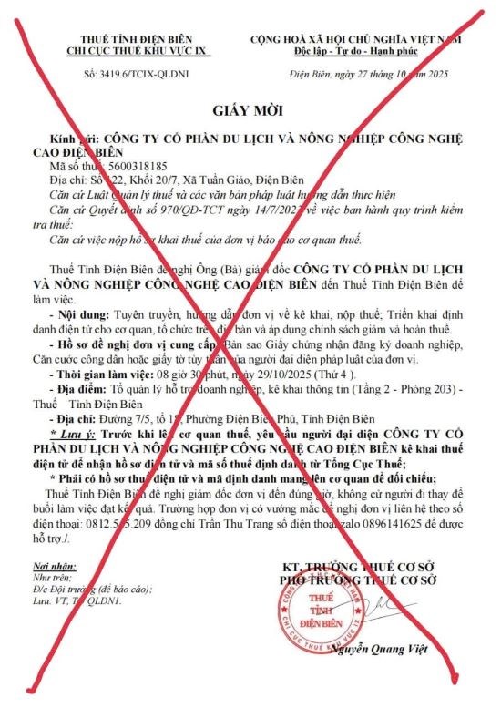 Hình ảnh văn bản giả mạo cơ quan thuế tỉnh Điện Biên mời doanh nghiệp đến làm việc. Ảnh: Thuế tỉnh Điện Biên