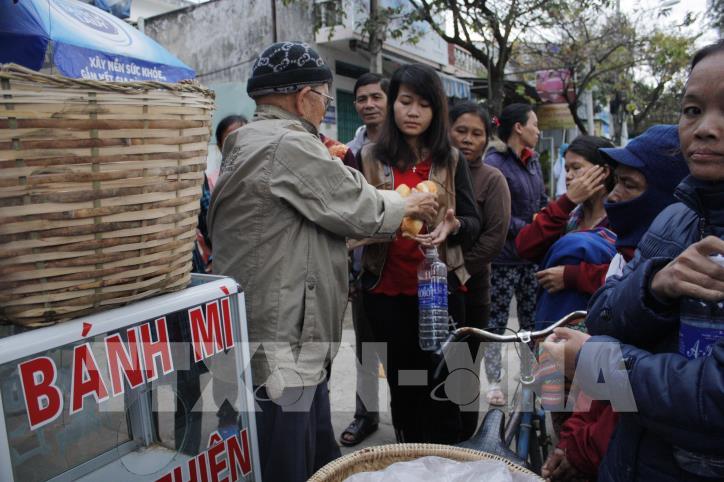 Cụ Bình phát bánh mì từ thiện cho người nhà bệnh nhân tại bệnh viện đa khoa tỉnh Kon Tum. Ảnh: Hồng Điệp – TTXVN