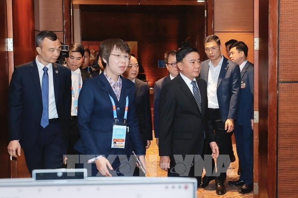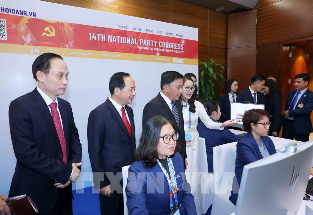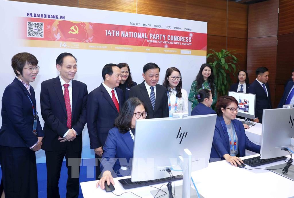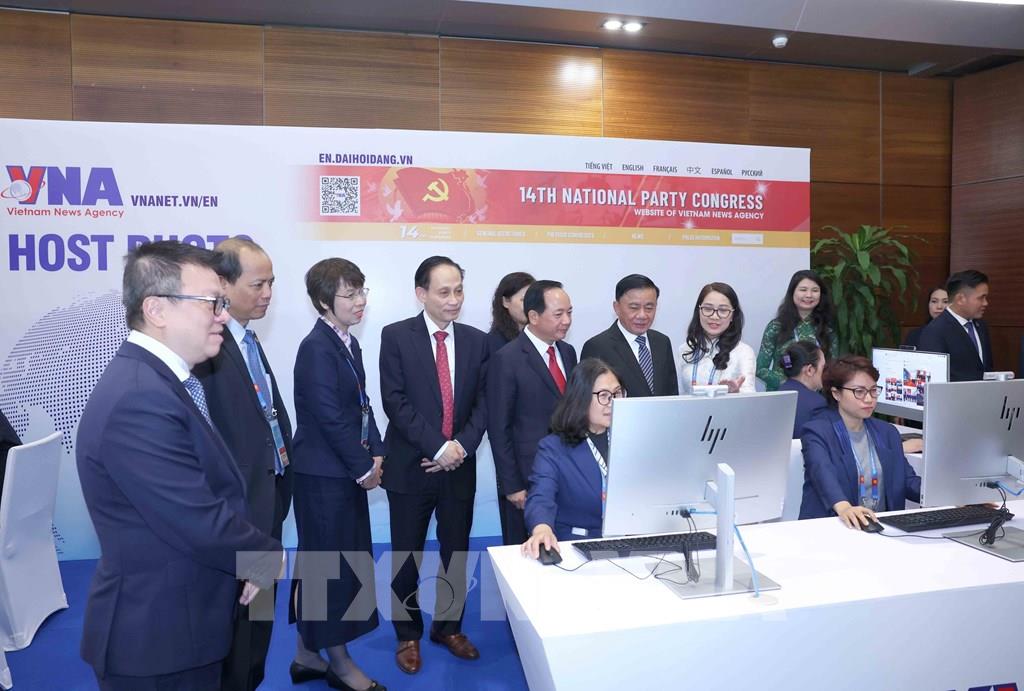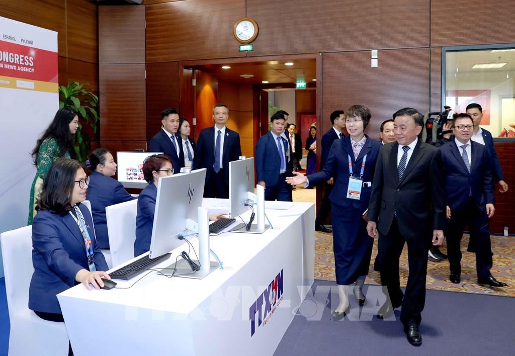 Thường trực Ban Bí thư Trần Cẩm Tú cùng các đại biểu thăm khu vực tác nghiệp của Thông tấn xã Việt Nam tại Trung tâm Báo chí. Ảnh: Phương Hoa - TTXVN