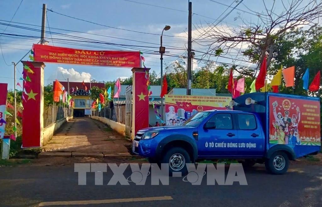 Tuyên truyền lưu động về thông tin bầu cử trong vùng đồng bào thiểu số xã biên giới Bù Gia Mập (Đồng Nai). Ảnh: K GỬIH-TTXVN