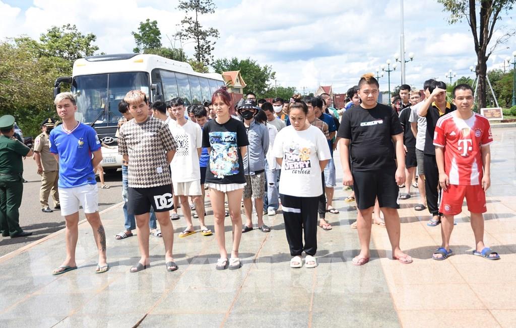 65 công dân Việt Nam liên quan hoạt động lừa đảo trực tuyến được cơ quan chức năng Campuchia trao trả. Ảnh: Đậu Tất Thành – TTXVN