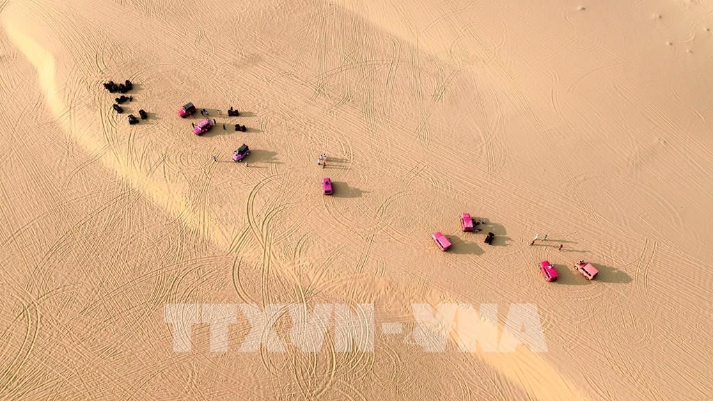 Xe du lịch tô điểm màu sắc đồi cát Mũi Dinh (xã Phước Dinh, Khánh Hòa). Ảnh: Nguyễn Thành - TTXVN