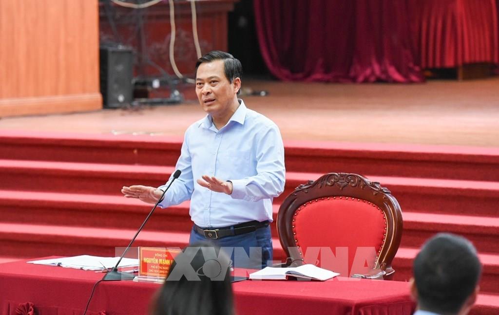Chủ tịch UBND phường Kinh Bắc, tỉnh Bắc Ninh Nguyễn Mạnh Hiếu trao đổi tại buổi gặp mặt. Ảnh: Thái Hùng - TTXVN