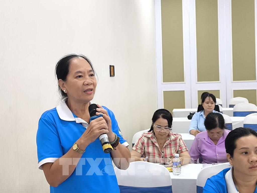Bà Trần Thị Thu Phương, phường Sơn Đông (Vĩnh Long) phát biểu tại buổi tọa đàm. Ảnh: Huỳnh Phúc Hậu - TTXVN