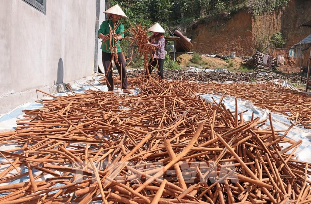 Gia đình anh Lê Văn Lưu ở thôn Quyết Tiến, xã Xuân Ái, Lào Cai, vay vốn ưu đãi thu mua quế, mua máy sơ chế quế xuất khẩu tạo việc làm cho hàng chục lao động. Ảnh: Trần Việt - TTXVN