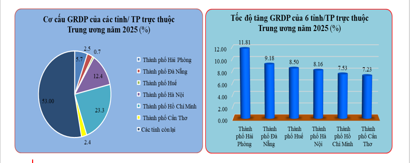 Theo Báo cáo về tốc độ tăng trưởng sản phẩm trên địa bàn (GRDP) của 34 tỉnh, thành phố trực thuộc Trung ương năm 2025 do Cục Thống kê (Bộ Tài chính) công bố, bên cạnh Hà Nội, TP. Hồ Chí Minh và Hải Phòng là thủ phủ kinh tế - chính trị - xã hội của Đồng bằng sông Hồng và Đông Nam Bộ, đầu tàu kinh tế cả nước với thế mạnh về thương mại, công nghiệp, logistics có tăng trưởng kinh tế năm 2005 khá nổi bật (Hà Nội tăng 8,2%, TP. Hồ Chí Minh tăng tăng 7,5%, Hải Phòng tăng 11,8%) thì Huế, Đà Nẵng và Cần Thơ là thủ phủ kinh tế - văn hóa - chính trị của vùng Bắc Trung Bộ và Duyên hải miền Trung và Đồng bằng sông Cửu Long tăng trưởng dựa vào thế mạnh về du lịch, dịch vụ, kinh tế số, nông nghiệp công nghệ cao.
