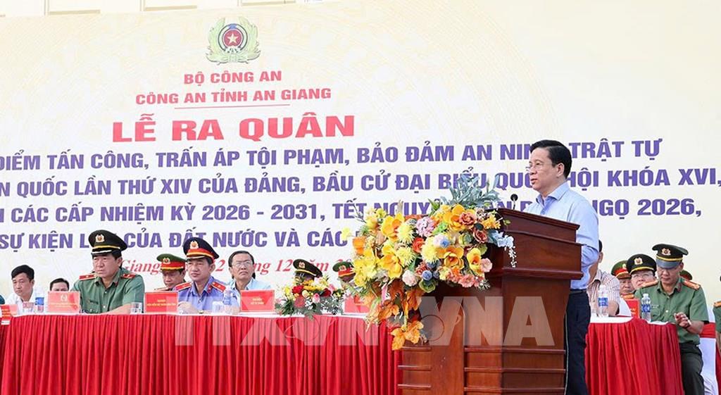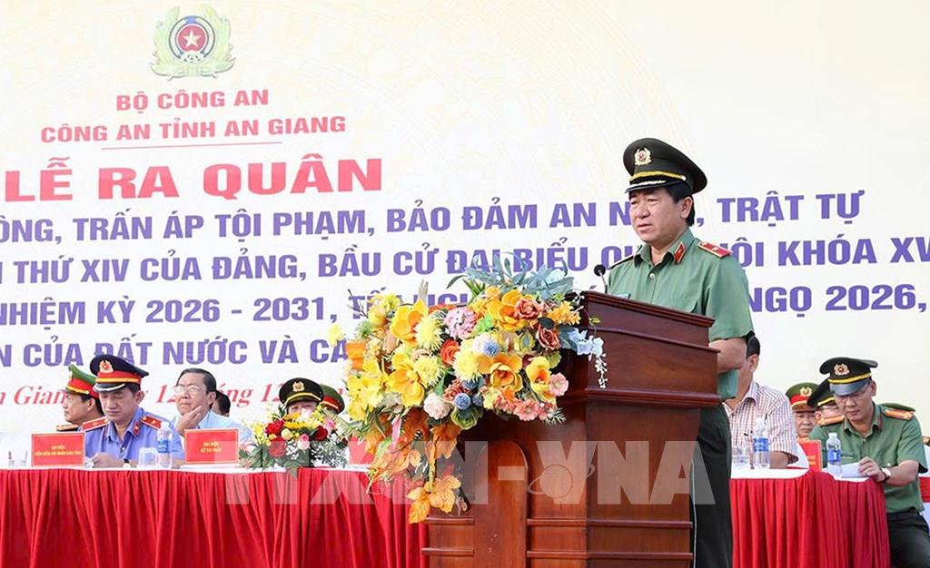 Sáng 12/12, Công an tỉnh An Giang đã tổ chức Lễ ra quân thực hiện đợt cao điểm tấn công trấn áp tội phạm bảo đảm an ninh trật tự Đại hội đại biểu toàn quốc lần thứ XIV của Đảng, bầu cử đại biểu Quốc hội khoá XVI, Hội đồng Nhân dân các cấp nhiệm kỳ 2026 – 2031, Tết Nguyên đán Bính Ngọ 2026.