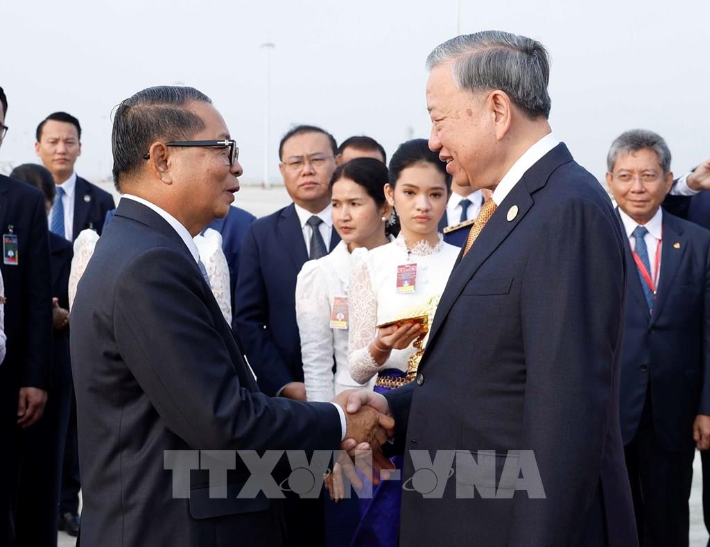 Ngay khi xuống sân bay, Tổng Bí thư Tô Lâm, Thủ tướng Chính phủ Phạm Minh Chính và Chủ tịch Quốc hội Trần Thanh Mẫn đã đi dọc thảm đỏ giữa hàng quân danh dự và bắt tay các thành viên đón đoàn. Sân bay quốc tế Techo rực rỡ quốc kỳ Việt Nam và Campuchia. Đông đảo tầng lớp nhân dân Campuchia có mặt tại sân bay, mang theo ảnh, cờ và hoa để chào mừng Tổng Bí thư Tô Lâm và Đoàn đại biểu cấp cao Việt Nam.