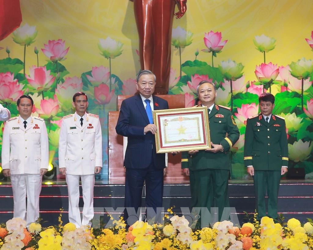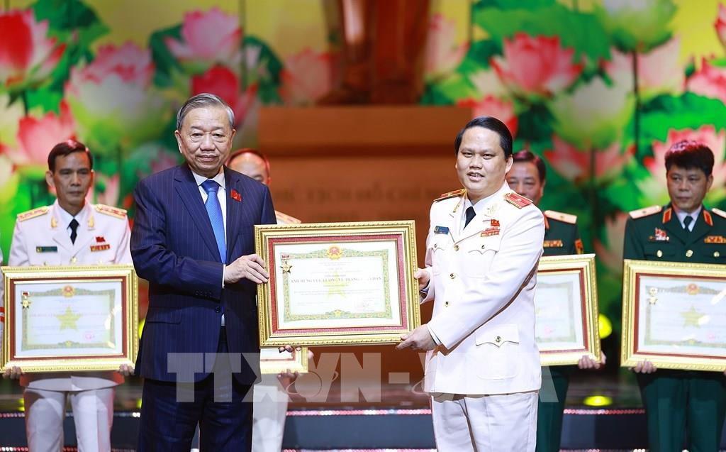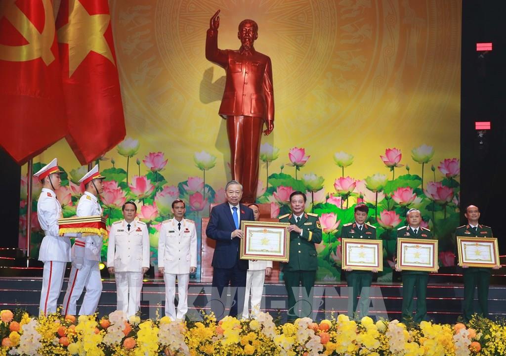 Tổng Bí thư Tô Lâm trao Danh hiệu Anh hùng Lực lượng vũ trang nhân dân cho các tập thể có thành tích đặc biệt xuất sắc. Ảnh: Dương Giang-TTXVN
