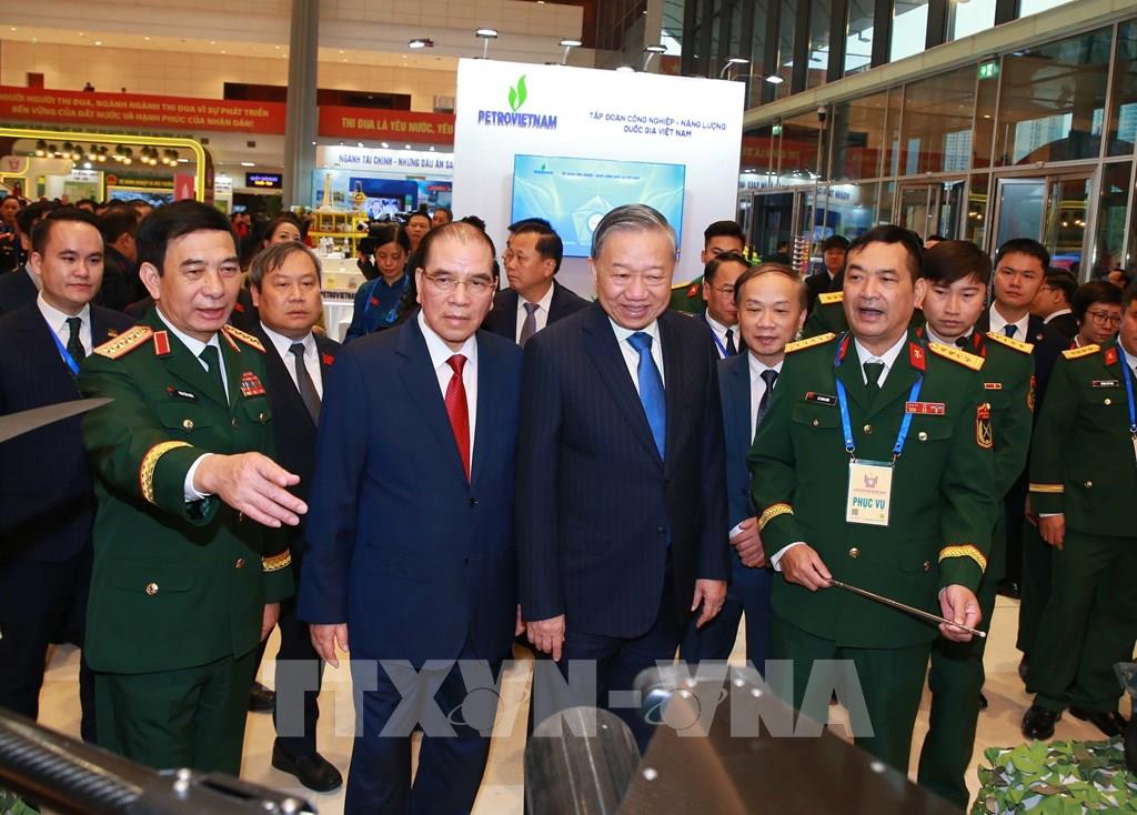 Tổng Bí thư Tô Lâm và các đại biểu tham quan gian trưng bày sản phẩm của Bộ Quốc phòng bên lề đại hội. Ảnh: Trọng Đức - TTXVN