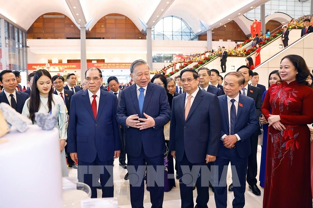 Tổng Bí thư Tô Lâm cùng các đồng chí lãnh đạo, nguyên lãnh đạo Đảng và Nhà nước tham quan các gian trưng bày tại Đại hội. Ảnh: Doãn Tấn - TTXVN