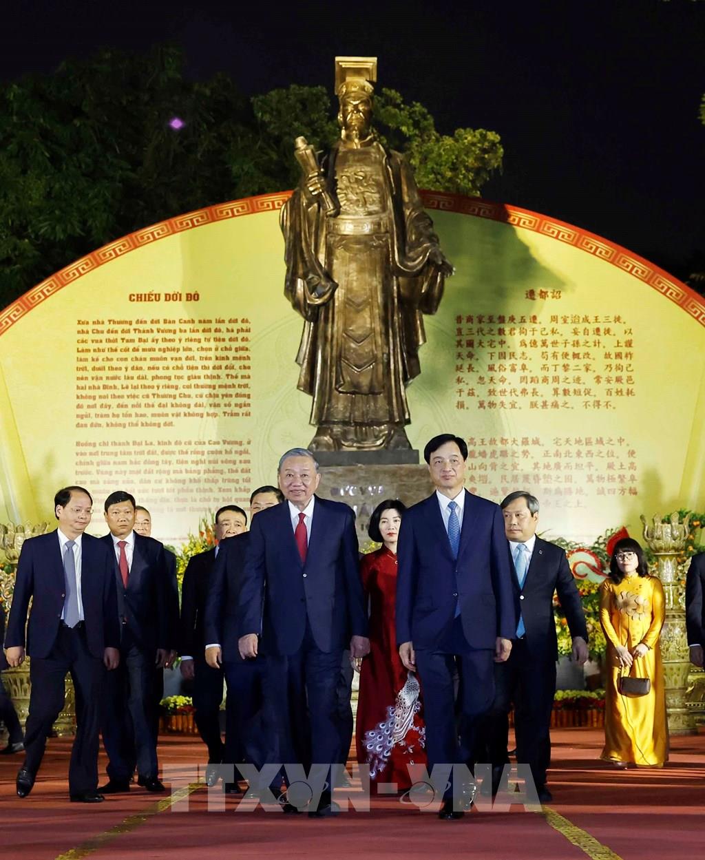 Tổng Bí thư Tô Lâm và Bí thư Thành ủy Hà Nội Nguyễn Duy Ngọc cùng các đại biểu tại tượng đài Vua Lý Thái Tổ. Ảnh: Thống Nhất - TTXVN
