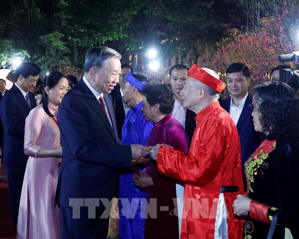 Tổng Bí thư Tô Lâm thăm hỏi, chúc Tết và mừng tuổi cho đại diện các tầng lớp nhân dân. Ảnh: Thống Nhất - TTXVN