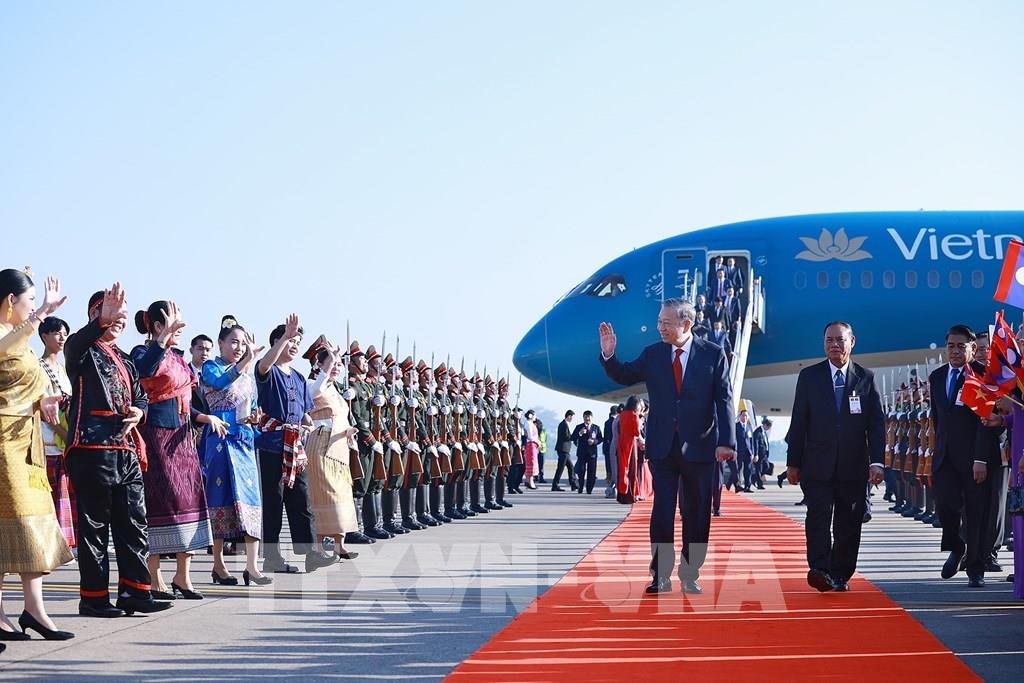 Lễ đón Tổng Bí thư Tô Lâm cùng Đoàn đại biểu cấp cao Việt Nam sang thăm cấp Nhà nước tới Lào. Ảnh: Dương Giang-TTXVN