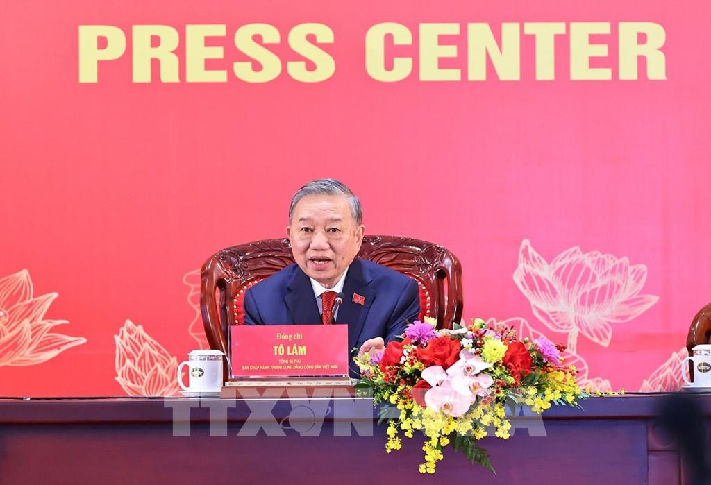 Tổng Bí thư Tô Lâm chủ trì họp báo công bố kết quả Đại hội XIV của Đảng. Ảnh: TTXVN