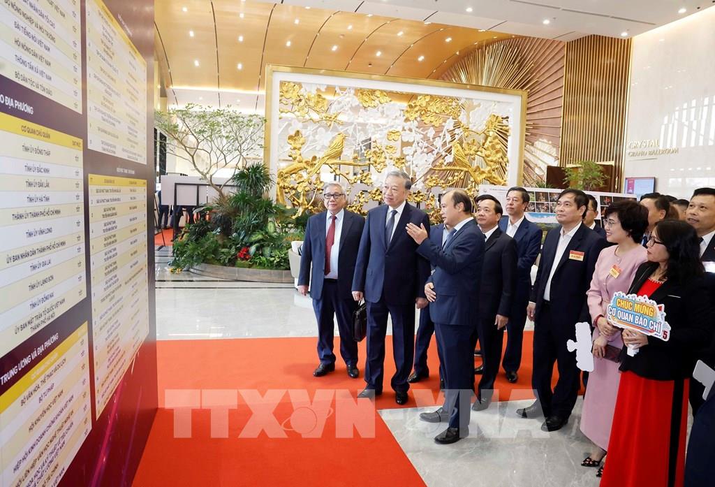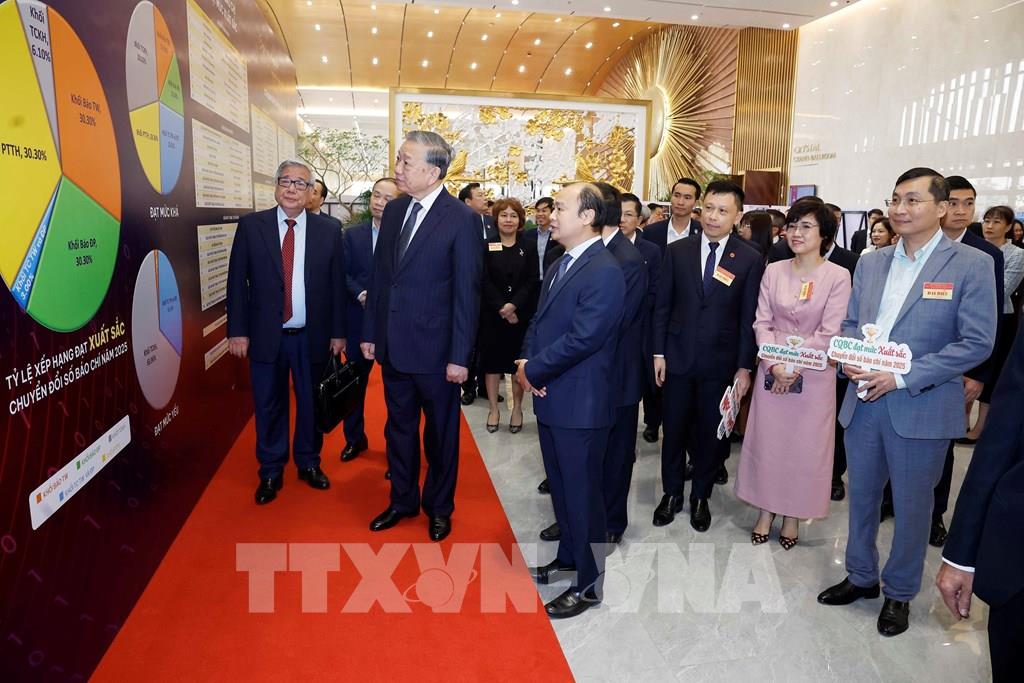 Tổng Bí thư Tô Lâm tham quan không gian trưng bày thành tựu chuyển đổi số trong báo chí. Ảnh: Thống Nhất - TTXVN