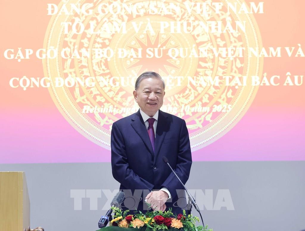 Theo đặc phái viên TTXVN, trong khuôn khổ chuyến thăm chính thức Cộng hòa Phần Lan, chiều 21/10 (giờ địa phương), tại Helsinki, Tổng Bí thư Tô Lâm và Phu nhân cùng Đoàn đại biểu cấp cao Việt Nam đã gặp gỡ cán bộ Đại sứ quán Việt Nam và cộng đồng người Việt tại các nước Bắc Âu (Phần Lan, Đan Mạch, Thụy Điển, Na Uy).