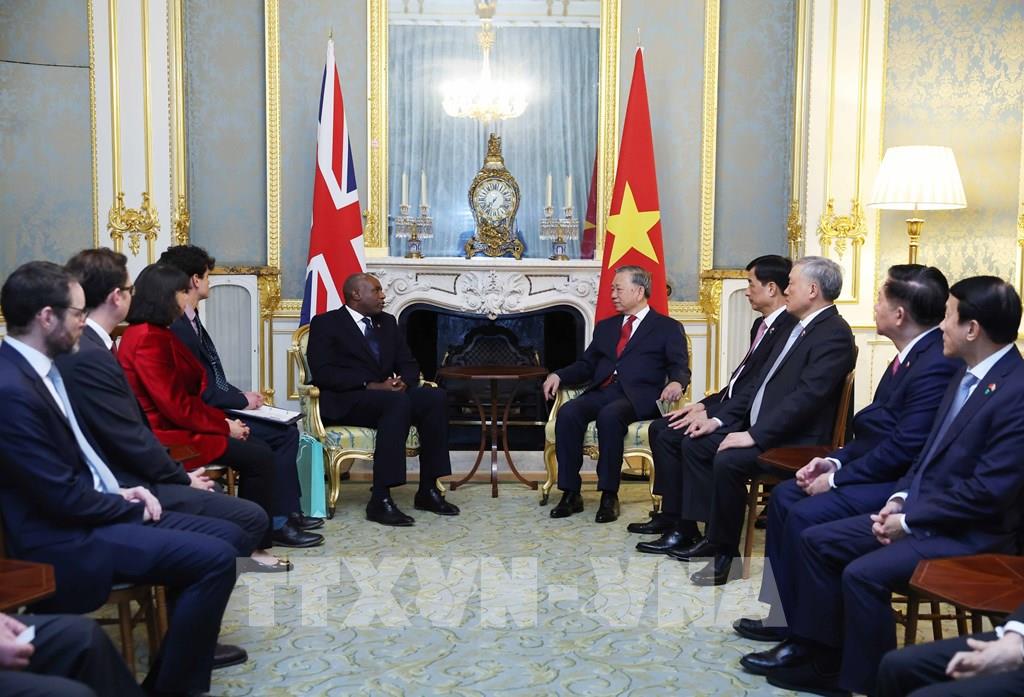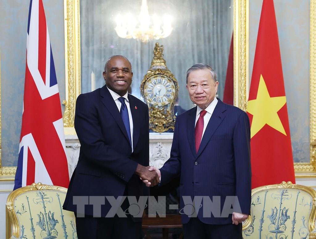 Tổng Bí thư Tô Lâm chia sẻ Phó Thủ tướng David Lammy là lãnh đạo đầu tiên của Anh mà Tổng Bí thư gặp sau khi hai nước chính thức nâng cấp quan hệ lên Đối tác chiến lược toàn diện và đề nghị ngay sau chuyến thăm, Chính phủ hai bên xây dựng Kế hoạch hành động, nhanh chóng củng cố các cơ chế hợp tác hiện có và thiết lập mới các cơ chế cần thiết, để đẩy mạnh hợp tác, tăng cường tin cậy chính trị, sớm đưa kim ngạch thương mại hai nước đạt mục tiêu 15 tỷ USD, tìm kiếm và thực hiện một số dự án hải đăng, tiêu biểu đúng với tầm mức quan hệ song phương tốt đẹp.