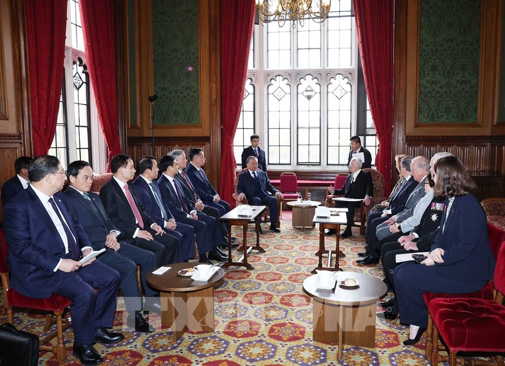 Chủ tịch Thượng viện Anh John McFall hoan nghênh và bày tỏ coi trọng chuyến thăm chính thức của Tổng Bí thư Tô Lâm và Đoàn đại biểu cấp cao Việt Nam sang thăm chính thức Anh. Chúc mừng những thành tựu phát triển kinh tế-xã hội, đối ngoại của Việt Nam dưới sự lãnh đạo của Đảng Cộng sản Việt Nam và cá nhân Tổng Bí thư Tô Lâm, ngài McFall khẳng định Anh luôn coi trọng phát triển quan hệ với Việt Nam, sẵn sàng hợp tác chặt chẽ nhằm làm sâu sắc hơn nữa hợp tác giữa hai nước trên các lĩnh vực, nhất là giáo dục-đào tạo, quốc phòng... Chủ tịch Thượng viện Anh cũng gửi lời hỏi thăm, chia sẻ về tình hình lũ lụt tại Việt Nam hiện tại.