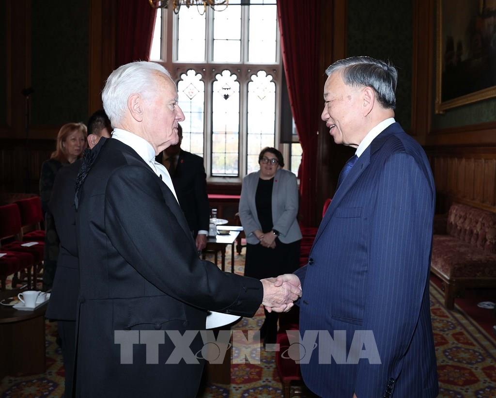 Theo Đặc phái viên TTXVN, ngày 29/10 (theo giờ địa phương), tại Cung điện Westminster ở thủ đô London, Tổng Bí thư Ban Chấp hành Trung ương Đảng Cộng sản Việt Nam Tô Lâm đã có cuộc hội kiến với Chủ tịch Thượng viện Anh John Mcfall (Nam tước McFall Xứ Alcluith) trong khuôn khổ chuyến thăm chính thức Liên hiệp Vương quốc Anh và Bắc Ireland.