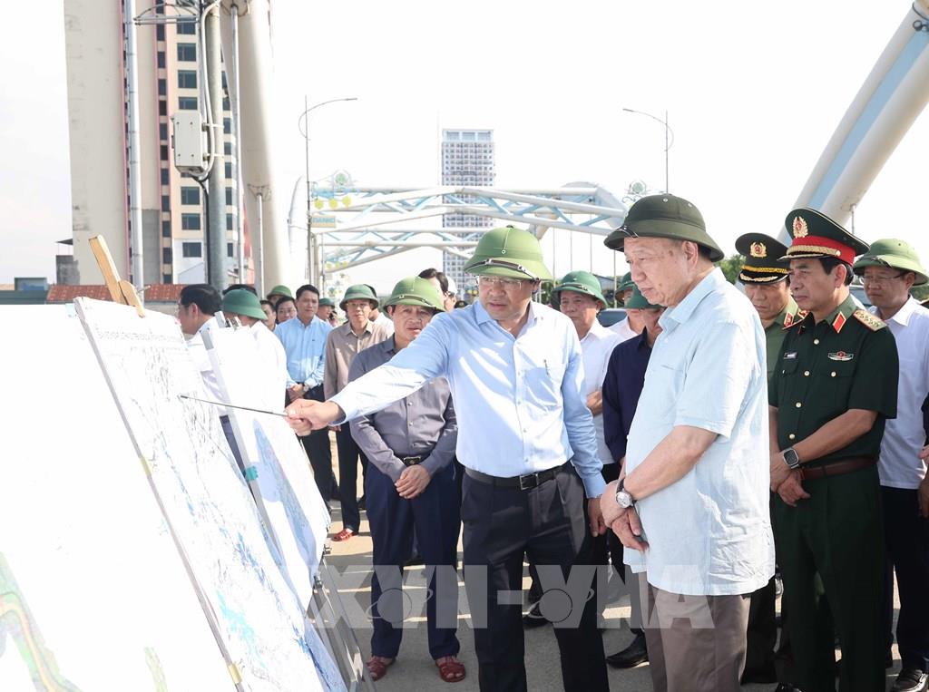 Tổng Bí thư Tô Lâm nghe lãnh đạo tỉnh Thái Nguyên báo cáo về công tác khắc phục hậu quả bão lụt tại cầu Bến Tượng. Ảnh: Thống Nhất-TTXVN