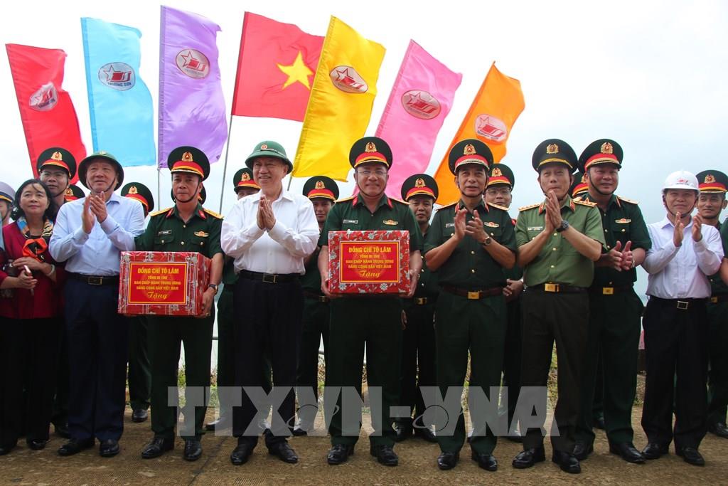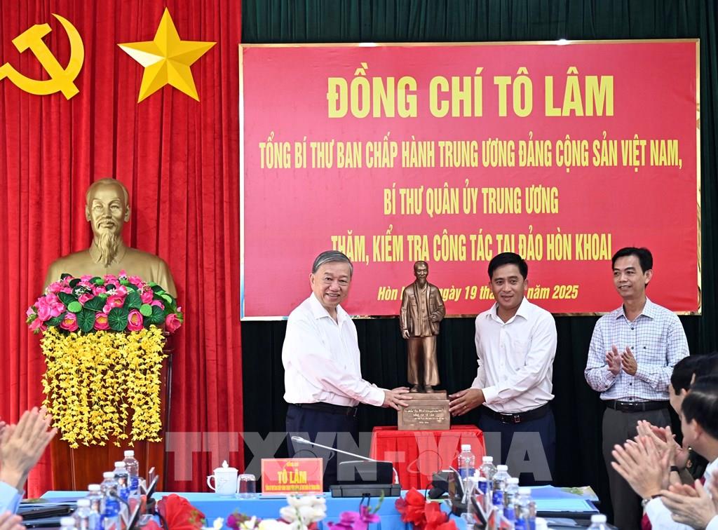 Tổng Bí thư Tô Lâm tặng quà các đơn vị thi công dự án trên đảo Hòn Khoai. Ảnh: Chanh Đa-TTXVN .