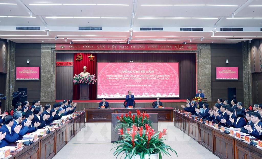 Sau khi nghe phát biểu ý kiến của các lãnh đạo Chính phủ, Quốc hội, lãnh đạo ban, bộ, ngành Trung ương, lãnh đạo thành phố Hà Nội, phát biểu kết luận tại buổi làm việc, Tổng Bí thư Tô Lâm đánh giá cao những kết quả phát triển toàn diện mà Hà Nội đã đạt được trong năm 2025. Thành ủy Hà Nội đã tập trung chỉ đạo trực diện các vấn đề bức xúc, kéo dài của Thủ đô như ùn tắc giao thông, ô nhiễm môi trường, ngập úng, trật tự đô thị, an toàn thực phẩm; coi như là những nhiệm vụ phải tạo chuyển biến đo được, được kiểm đếm theo tháng, theo quý, gắn với trách nhiệm cụ thể của từng ngành, từng cấp. Đặc biệt là công tác giải phóng mặt bằng, triển khai các dự án hạ tầng đô thị đã ách tắc nhiều năm với tốc độ rất nhanh, tinh thần rất khẩn trương. Những chuyển biến này cho thấy Hà Nội đang hình thành phương thức lãnh đạo, điều hành dựa trên kỷ cương và hiệu quả thực chất.