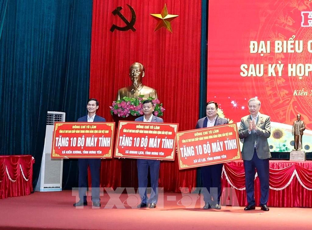 Tổng Bí thư Tô Lâm tặng máy tính cho các xã Kiến Xương, Lê Lợi và Quang Lịch (Hưng Yên). Ảnh: Thống Nhất – TTXVN