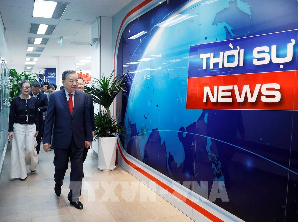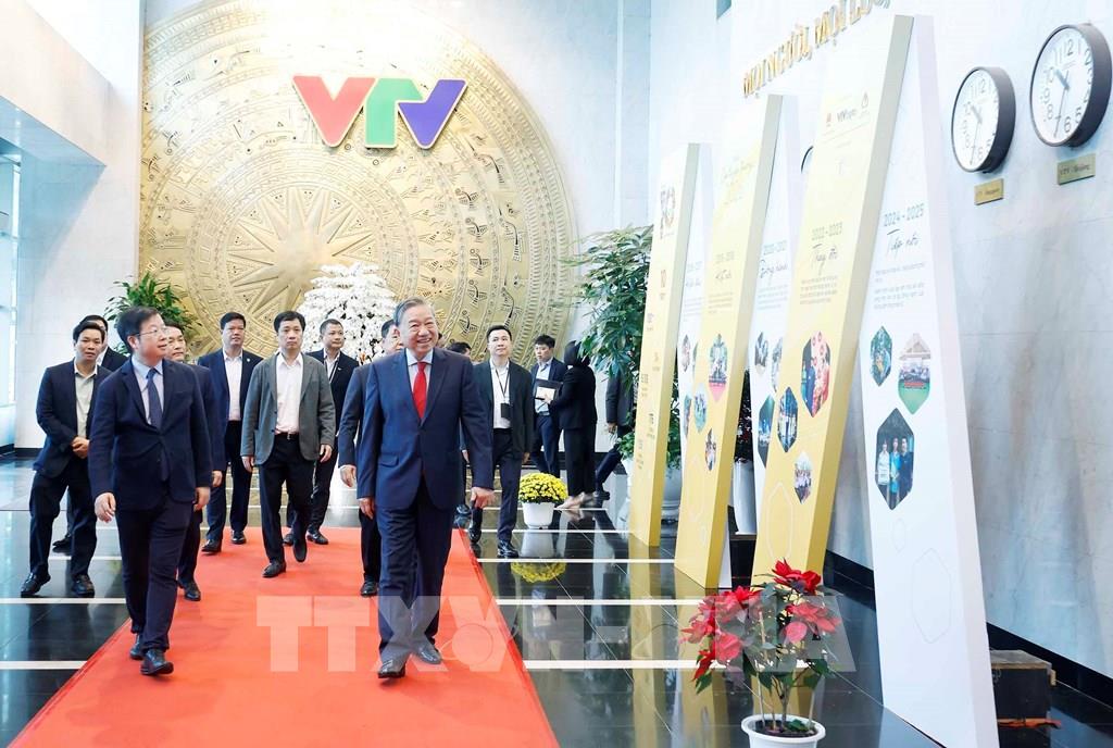 Tới thăm và chúc Tết tại Đài Truyền hình Việt Nam, Tổng Bí thư Tô Lâm đã tham quan khu vực sản xuất chương trình, trường quay, trung tâm phát sóng, nghe báo cáo về kết quả công tác, lắng nghe chia sẻ của cán bộ, phóng viên.