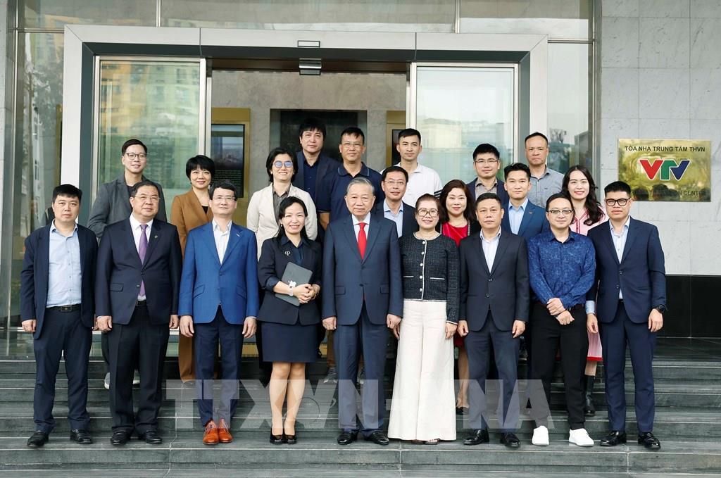 Tổng Bí thư Tô Lâm với cán bộ, phóng viên, biên tập viên và kỹ thuật viên Đài Truyền hình Việt Nam. Ảnh: Thống Nhất-TTXVN