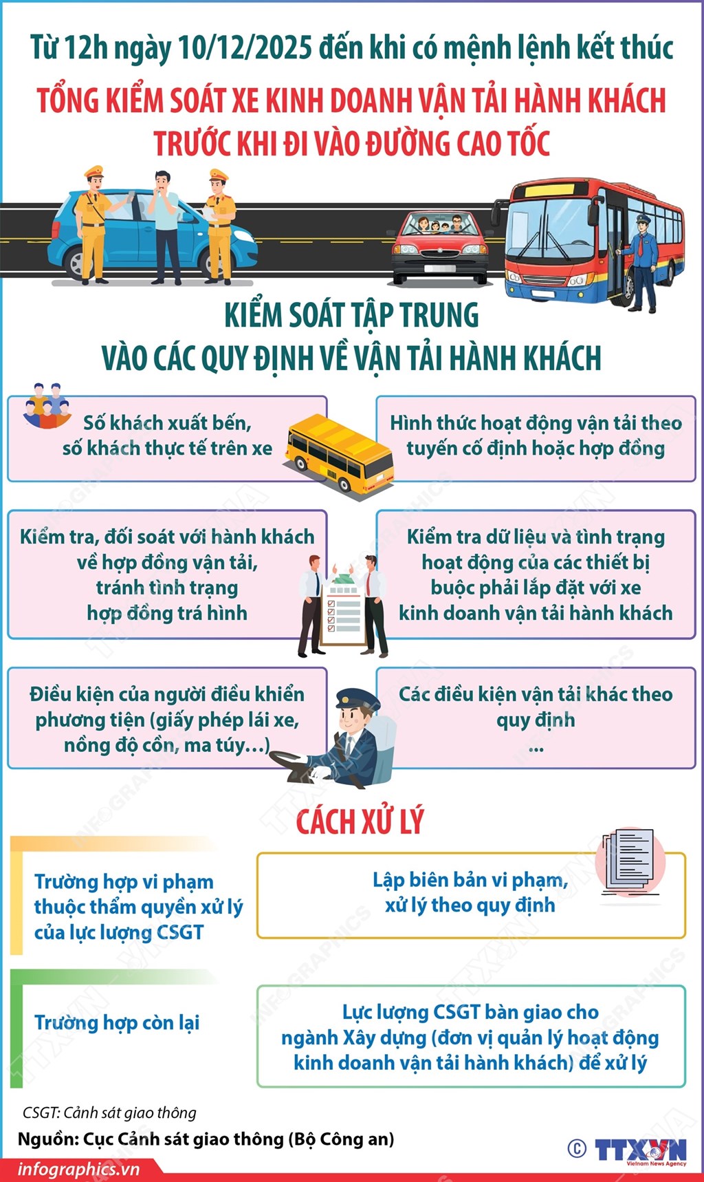 Để đảm bảo trật tự an toàn giao thông, bảo vệ tính mạng, sức khỏe, tài sản của Nhân dân, Cục Cảnh sát giao thông (Bộ Công an) tiến hành tổng kiểm soát đối với xe kinh doanh vận tải trước khi di chuyển vào lưu thông trên các tuyến đường cao tốc. Thời gian thực hiện dự kiến từ 12h ngày 10/12/2025, đến khi có mệnh lệnh kết thúc