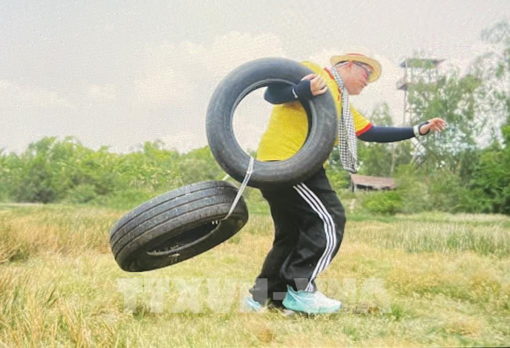 Du khách trải nghiệm hoạt động thể lực vác nặng tại khu dừng chân giữa đoạn đường. Ảnh: Hồng Nhung - TTXVN