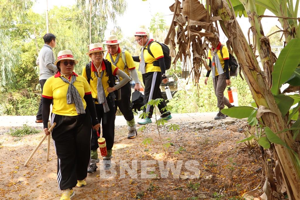 Đoàn du khách đi bộ xuyên rừng với đoạn đường gần 20km. Ảnh: Hồng Nhung - TTXVN