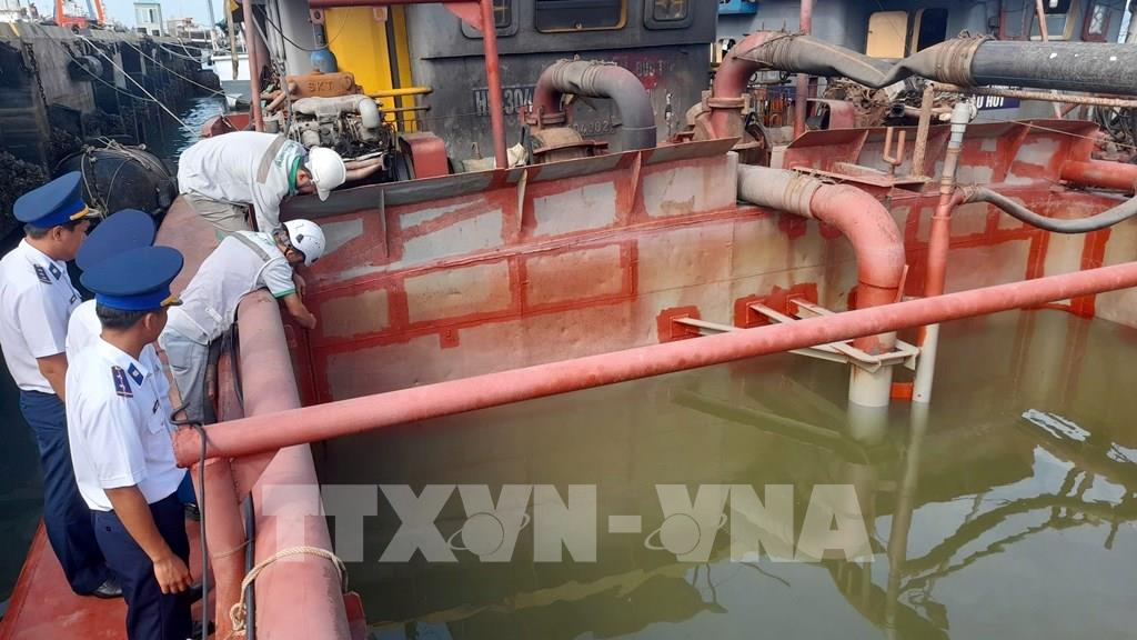 Giám định tang vật trên xà lan HD 3044. Ảnh: TTXVN phát