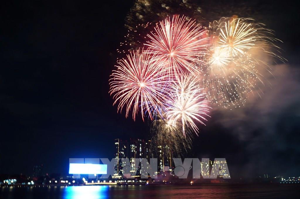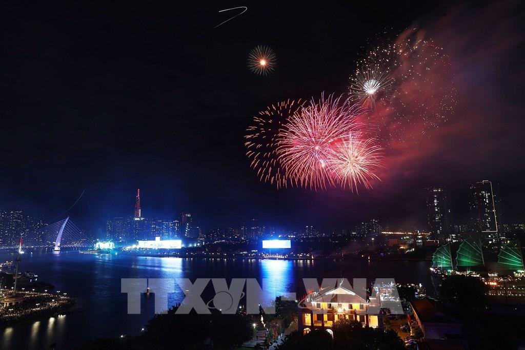 Pháo hoa bung nở trên nền trời của Thành phố Hồ Chí Minh. Ảnh: Thu Hương - TTXVN