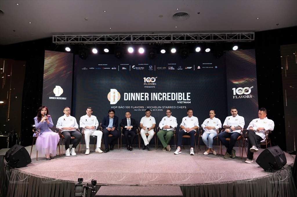 Họp báo công bố sự kiện "100 Flavors - Michelin Starred Chef" chính thức diễn ra với sự hiện diện đầy đủ của 13 siêu đầu bếp Michelin lừng danh thế giới. Ảnh: vietnam.vnanet.vn