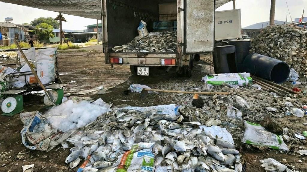 Số cá chết được Công ty TNHH Phúc Lộc thu mua, chế biến làm bột cá, góp phần hỗ trợ người nuôi trồng thủy sản giảm bớt khó khăn trong giai đoạn hiện nay. Ảnh: Hoàng Nhị - TTXVN