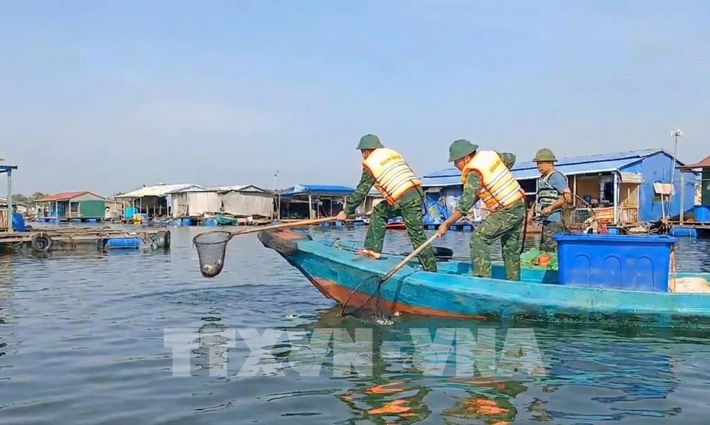 Lực lượng chức năng hỗ trợ người dân thu gom cá chết trong bè nuôi và trên sông Chà Và, xã Long Sơn. Ảnh: Hoàng Nhị - TTXVN