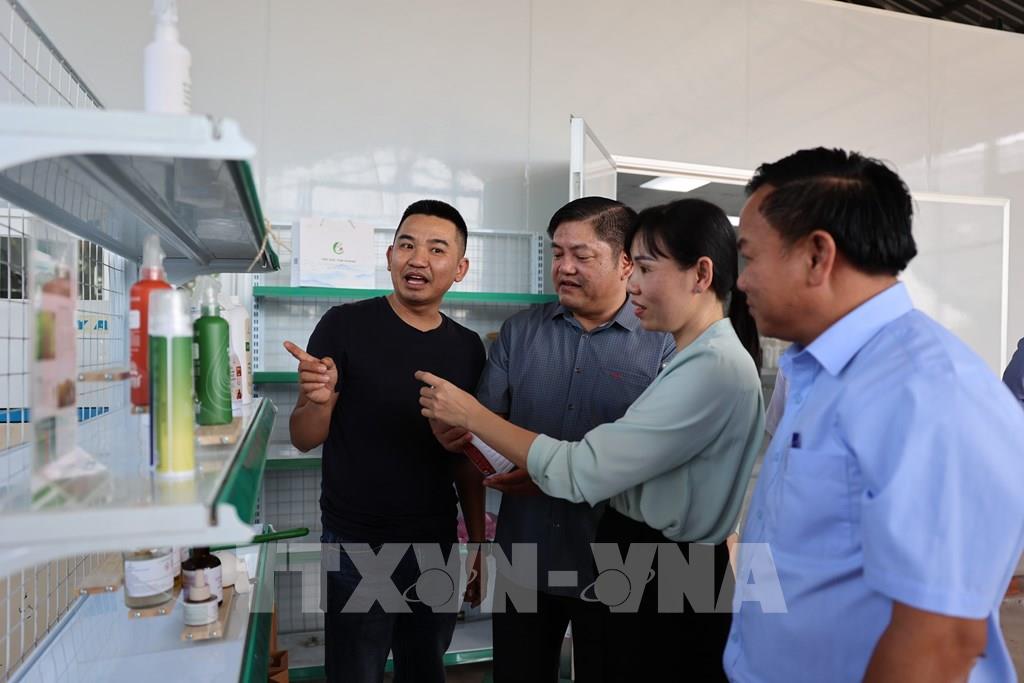 Đại diện Chi cục Phát triển nông thôn TP. Hồ Chí Minh và UBND xã Nghĩa Thành tham quan sản phẩm của Hợp tác xã Đá Bạc xanh. Ảnh: Hoàng Nhị - TTXVN