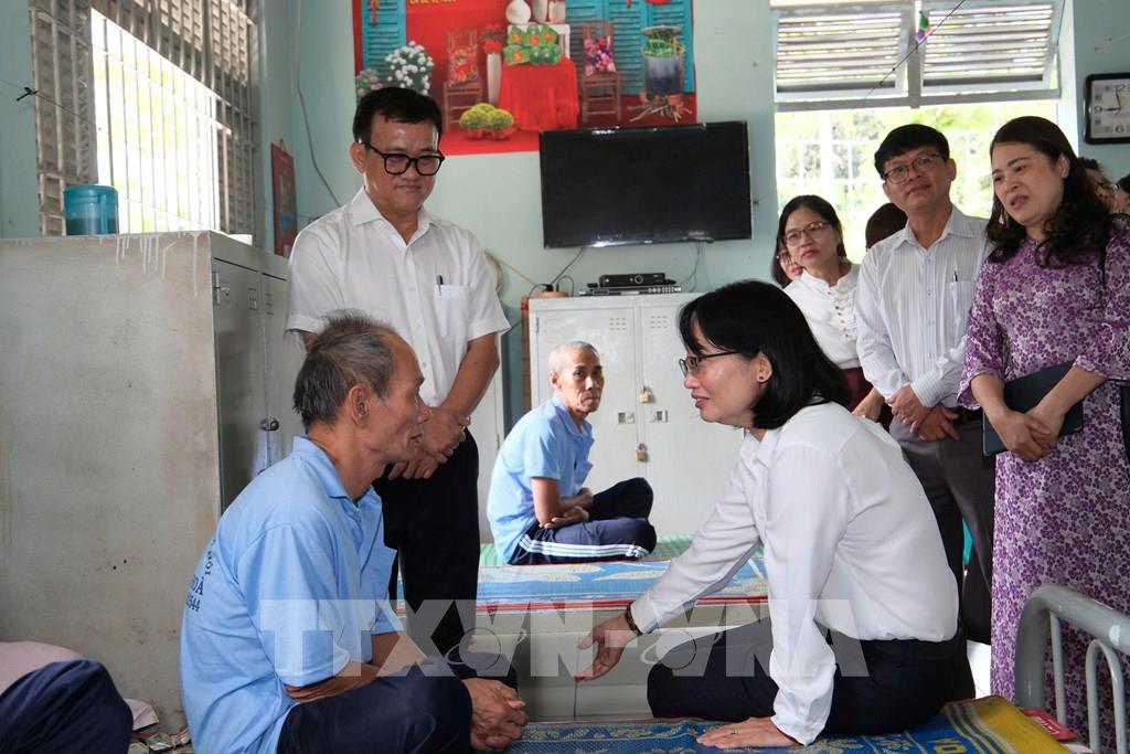 Bà Trần Thị Diệu Thúy, Phó Chủ tịch UBND Thành phố Hồ Chí Minh, thăm hỏi các hoàn cảnh tại Trung tâm Bảo trợ xã hội Chánh Phú Hòa. Ảnh: Huyền Trang - TTXVN