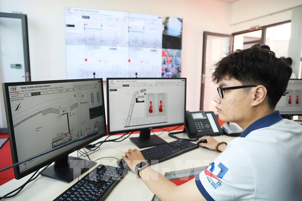 Nhân viên kỹ thuật làm việc trong Trung tâm vận hành cống ngăn triều Bến Nghé. Ảnh: Hồng Đạt - TTXVN