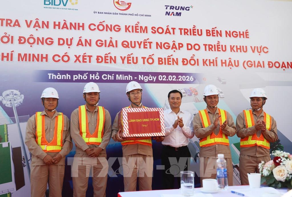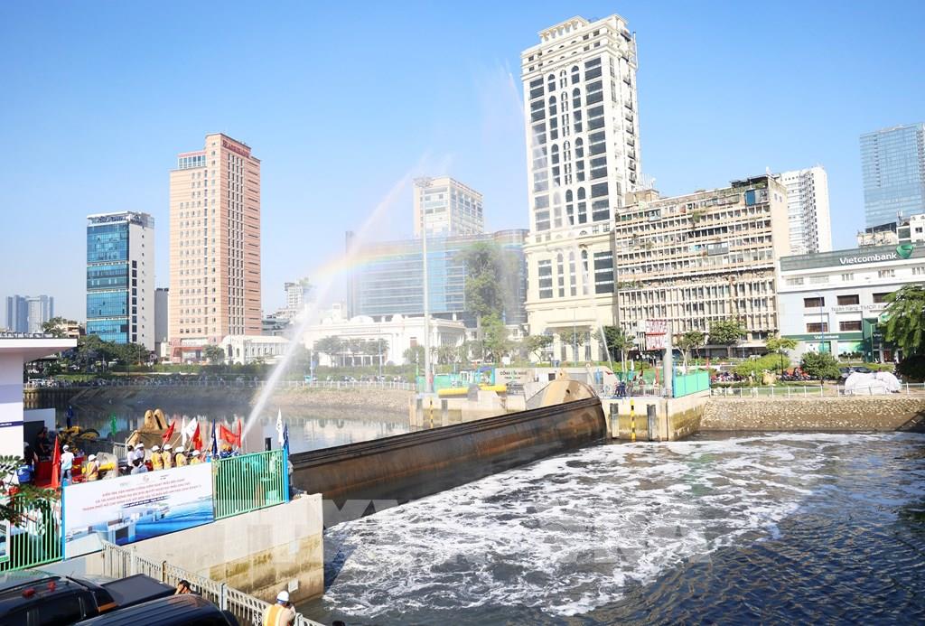 Nghi thức tái vận hành cống Bến Nghé, tái khởi động Dự án “Giải quyết ngập do triều khu vực TP. Hồ Chí Minh, có xét đến yếu tố biến đổi khí hậu - giai đoạn 1”. Ảnh: Hồng Đạt - TTXVN