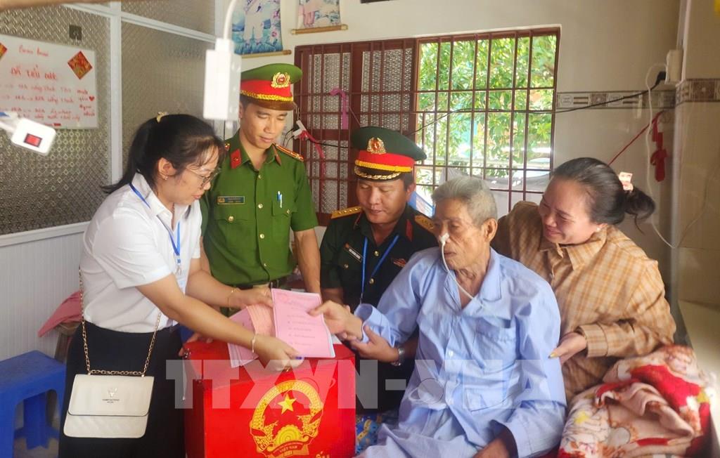 Tổ bầu cử ấp Thiềng Liềng (xã đảo Thạnh An) mang thùng phiếu đến nhà hỗ trợ hai cử tri đặc biệt Nguyễn văn Thanh (Sinh năm 1942) và Trần Thị Nết (Sinh năm 1944) thực hiện quyền công dân. Ảnh: Hữu Duyên - TTXVN