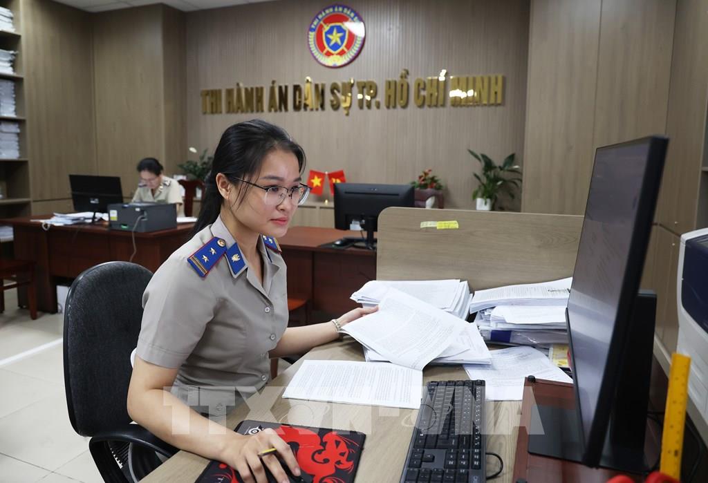 Công chức Thi hành án dân sự TP. Hồ Chí Minh xử lý hồ sơ nghiệp vụ trên môi trường số. Ảnh: Hồng Đạt - TTXVN