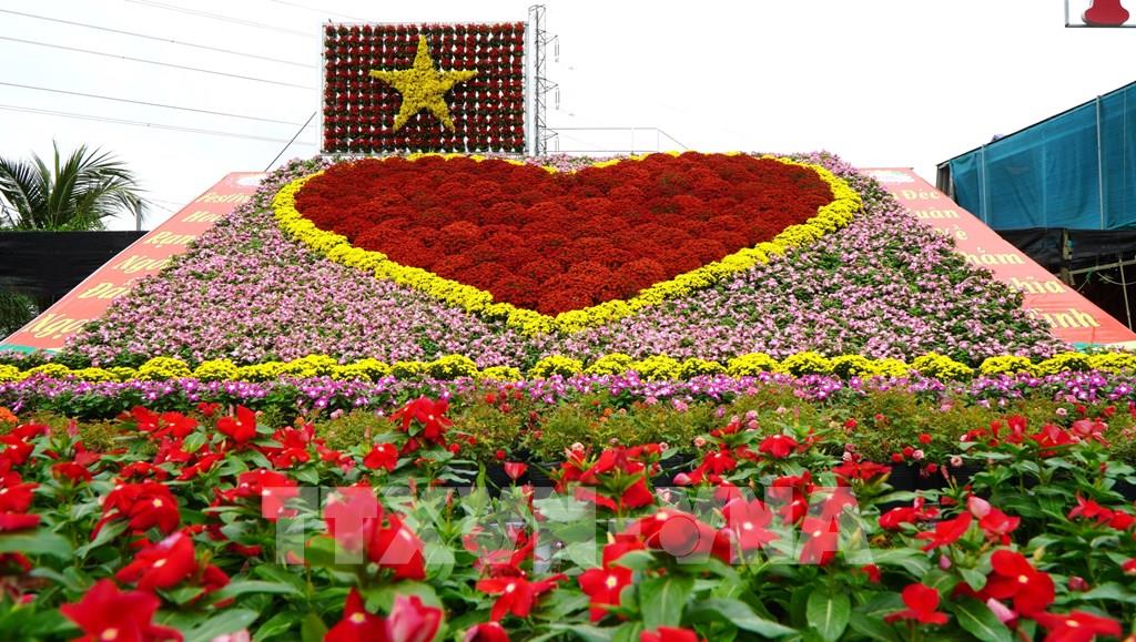 Tiểu cảnh “Trái tim” kết hợp cùng cờ đỏ, sao vàng được xếp hình từ khoảng 1.700 chậu hoa tươi các loại. Ảnh: Nhựt An - TTXVN