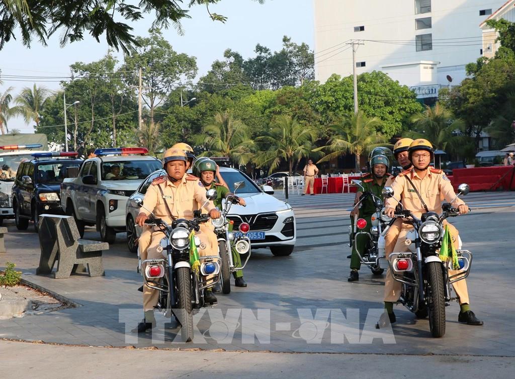 Lực lượng công an diễu hành, tuần tra tại một số tuyến đường ở đặc khu Phú Quốc. Ảnh: Văn Sĩ - TTXVN