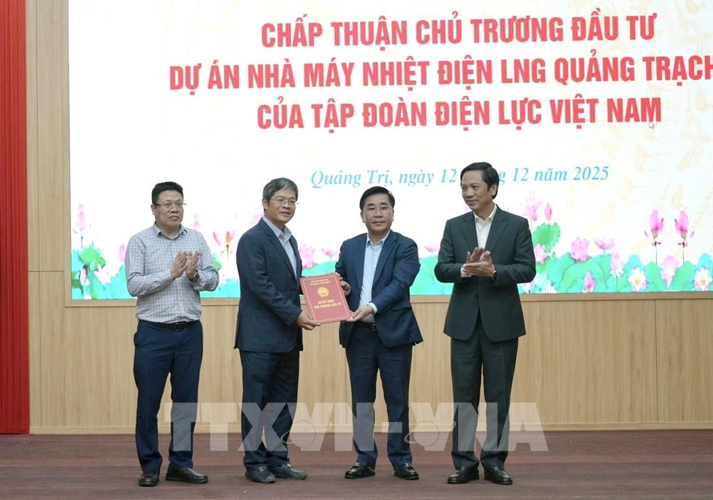 Lãnh đạo UBND Quảng Trị trao Quyết định chấp thuận chủ trương đầu tư Dự án Nhà máy Nhiệt điện LNG Quảng Trạch III cho Tập đoàn Điện lực Việt Nam. Ảnh: Nguyên Linh-TTXVN