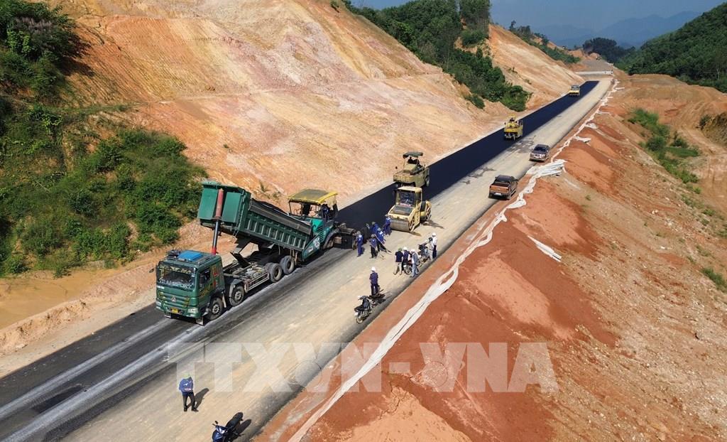 Nhà thầu tận dụng thời tiết thuận lợi, khắc phục tình trạng mưa nhiều tại các tỉnh miền núi phía Bắc triển khai thảm những đoạn trên tuyến sau khi thi công nền xong. Ảnh: Quốc Khánh - TTXVN